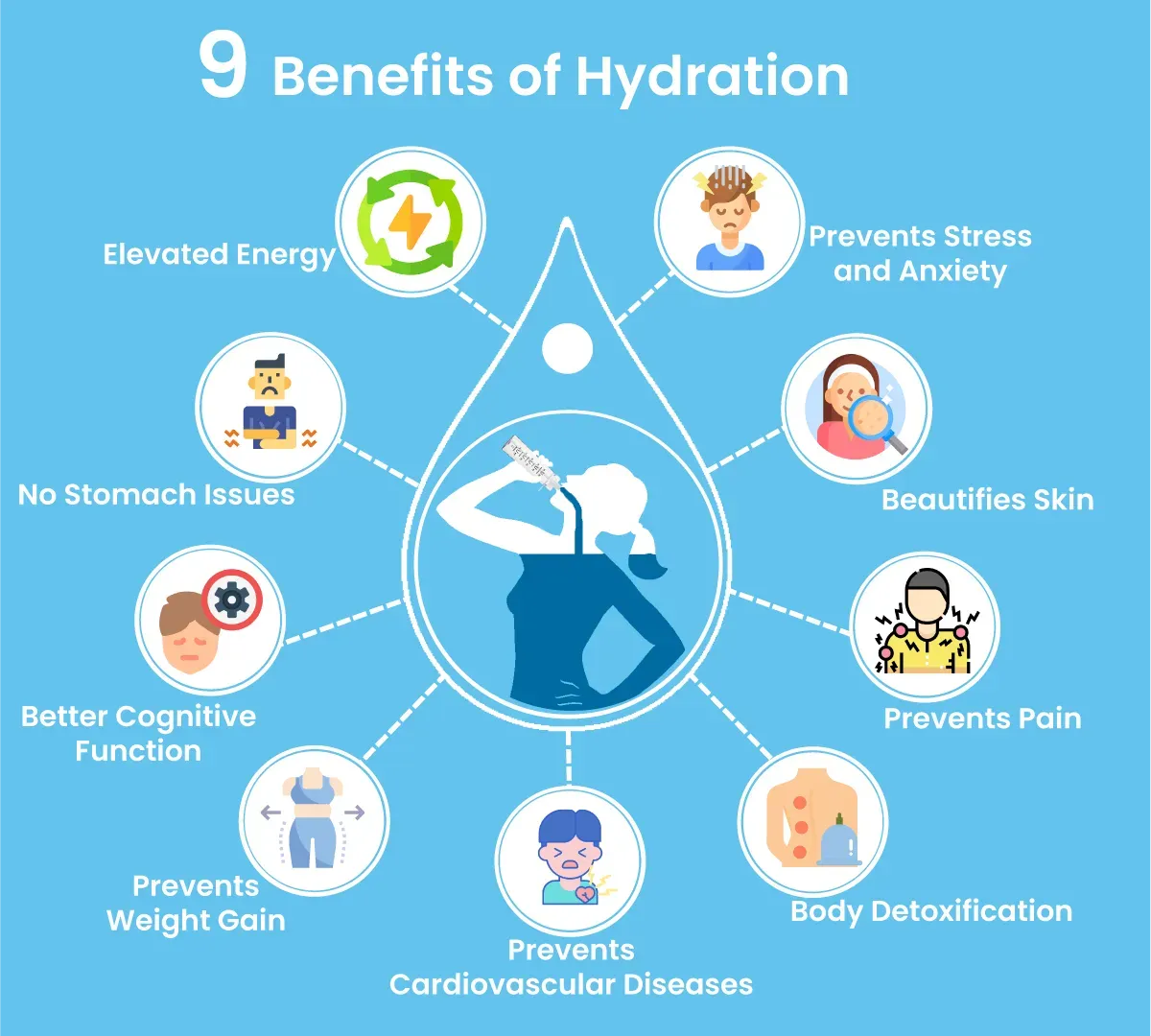 What hydration means for health Water is a core part of body mass and supports temperature regulation, joint health, nutrient transport, digestion, and cognitive performance. Proper hydration promotes alertness and energy; dehydration can cause fatigue, dizziness, headaches, and reduced exercise endurance.