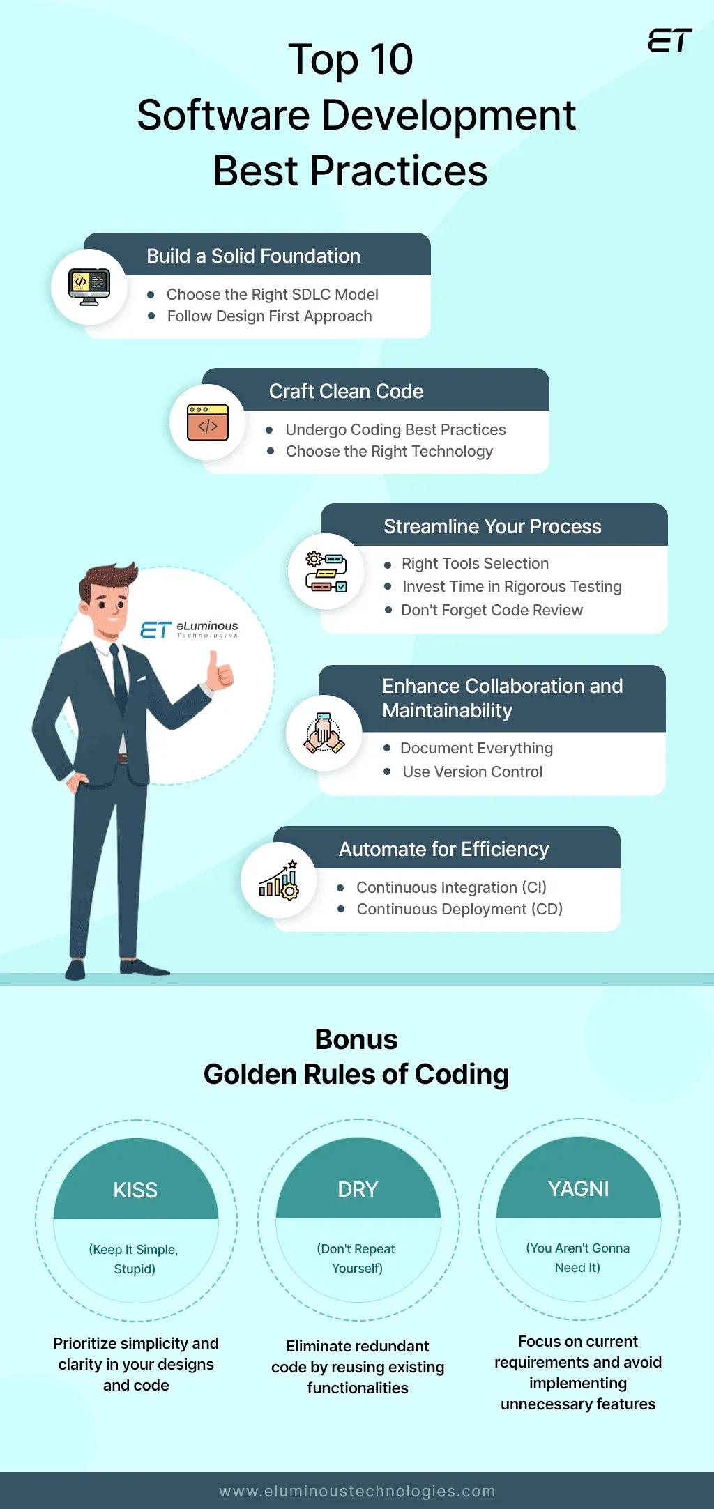 What are the core software development best practices that help teams deliver faster with fewer defects, leveraging agile development best practices, continuous integration and deployment, test-driven development benefits, code quality and bug prevention, and release automation and CI/CD?